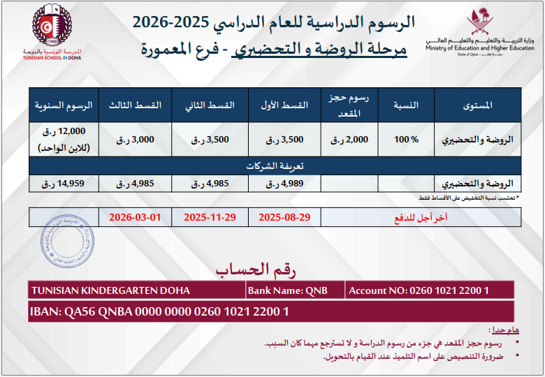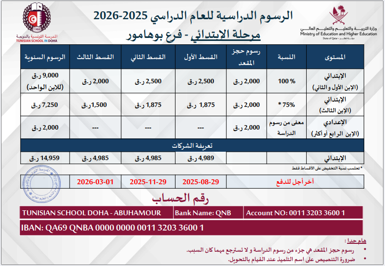 2026 -2025 جداول الرسوم الدراسية