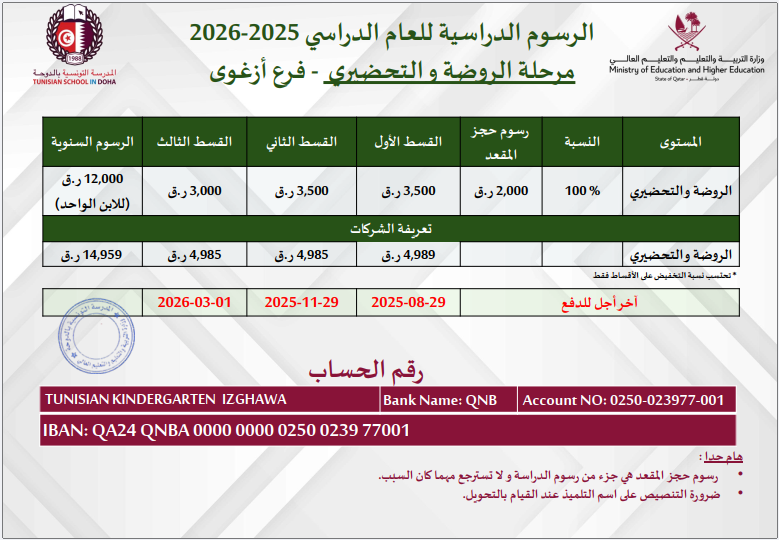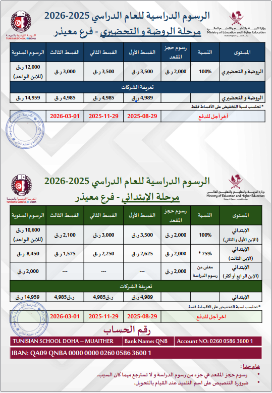 2026 -2025 جداول الرسوم الدراسية